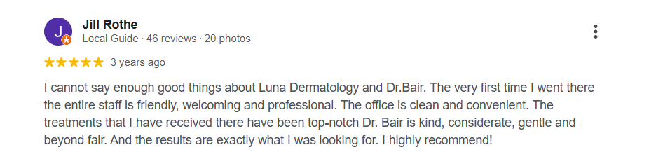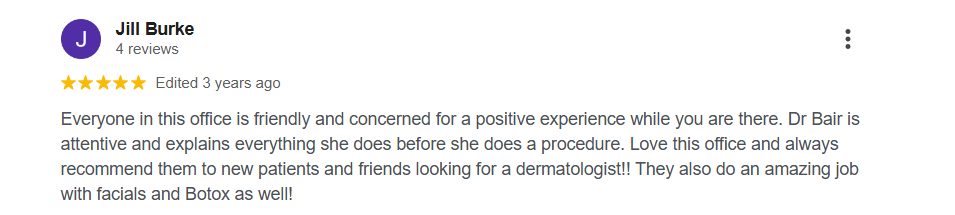 Before starting her own practice, Dr. Bair worked for a number of top dermatology clinics in the country, including Gulf Coast Dermatology in Florida and Greenwich Village Dermatology in Manhattan. In addition, she is a trained Mohs surgeon for the removal of skin cancers and has authored a number of peer-reviewed publications on dermatological topics. Beyond her private practice work, she has spent time serving patients at the Fatima Pediatric Medical Center and the VA Hospital in Castle Point, NY.
